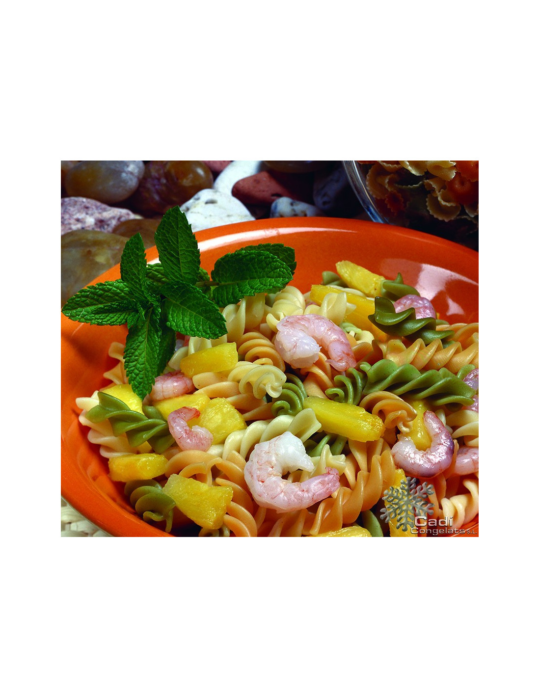 Ingredients: Espirals de pasta cuita (sèmola de blat dur, tomàquet i espinacs), pinya i cua de gamba pelada. Conté crustacis i cereals amb gluten. Elaborat en una fabrica que treballa amb fruits de pela, llet, ou, peix, soia, sulfits i mol·luscs.